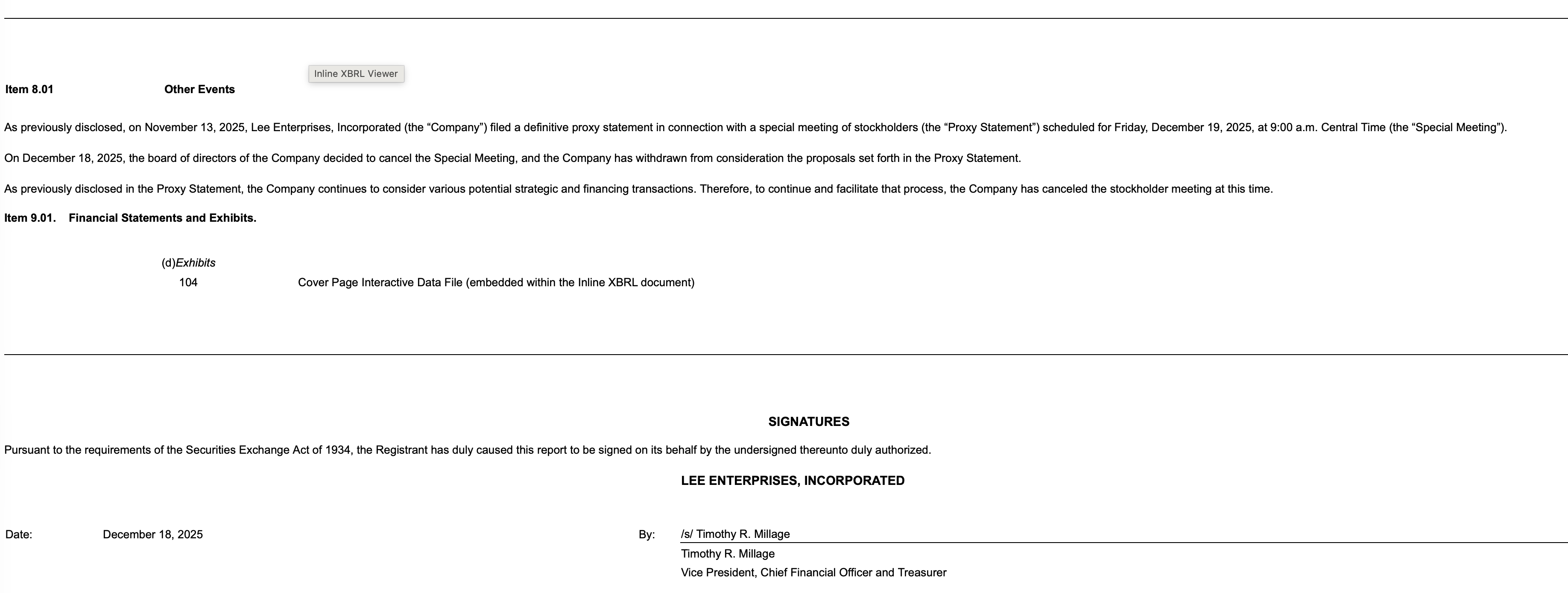 CLICK HERE to view the Lee Enterprise post on SEC site on the shareholder meeting cancellation.