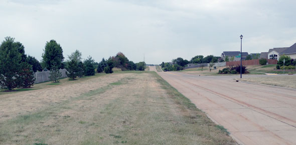 Looking west on 53rd Avenue toward Middle Road roundabout. The city owns enough right-of-way to build another two lanes south of the existing two lanes of 53rd Avenue.