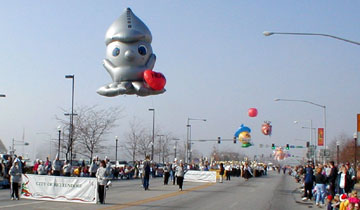 The city of Bettendorf's hot air balloon, the Tin Man from "The Wizard of Oz," drifts above Davenport's River Drive during the Quad City Arts Festival of Trees Parade. In the background is the Bettendorf High School Marching Band.