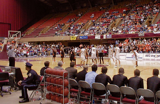 The Bettendorf Bulldogs prepare for tip-off against Waterloo East at the 4A semifinal contest at Vets Auditorium, Des Moines, Friday, March 19. After rallying from 12 points down to tie the score in the fourth period, the Bulldogs fell to Waterloo East 51-49. On a last second shot by Brett Wessels, the Bulldogs defeated Ottumwa, 39-37, to take home the third place trophy in the 4A tournament.