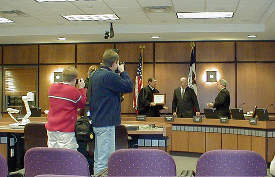 District Court Judge John Nahra and City Administrator Decker Ploehn pose for the cameras with new Bettendorf Mayor Mike Freemire, center, after the swearing-in ceremony at City Hall Monday, Jan. 5.