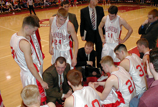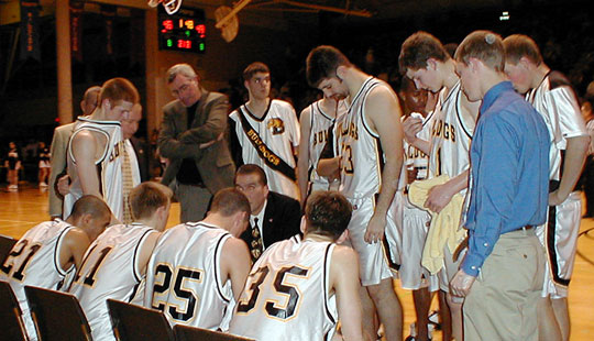 North Scott Coach Brent Reissen exhorts his players during the overtime period of the Lancer-Bulldog game Friday at "The Pit." The Bulldogs won the game 61-57, led by Bulldog senior guard Drew Wessels who scored 30 points. The win kept Bettendorf's conference title hopes alive and left Muscatine alone atop the MAC with one week left in the regular season. With the loss, North Scott slipped into a second place tie in the league with Bettendorf and Assumption.