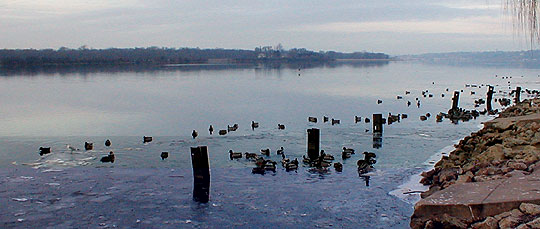 Duck swim among patches of ice along the Mississippi River shoreline in Bettendorf. The recent cold snap created more ice on area ponds and rivers, but a thaw with temperatures in the 50's are expected over the weekend.