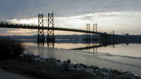 Ice has begun forming on the Mississippi River shore, even though temperatures so far this winter have been very mild. The elegant I-74 Twin Bridge overlooks the Leach Park ducks along the shoreline.