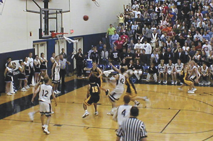 The ball and the game are up for grabs in this final play of the game Friday night between Bettendorf and Pleasant Valley boys basketball teams. With Bettendorf ahead by two points, Pleasant Valley lobbed the ball to the center with less than 2 seconds left. The ball sailed high and the Bulldogs escaped with a 50-48 win at Pleasant Valley.