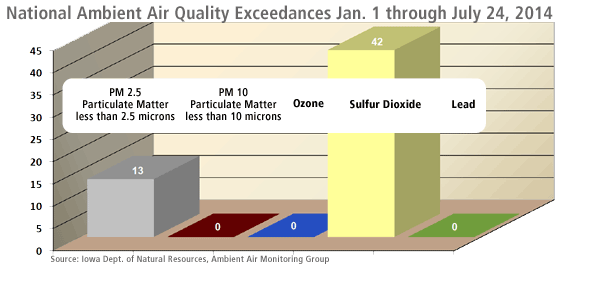 Iowa air quality monitors have recorded 42 exceedances of ambient air quality standards from sulfur dioxide pollution and 13 from fine particulate matter (PM 2.5) pollution during the first seven months of this year. During all of 2013, a total of 67 exceedances of National Ambient Air Quality Standards (NAAQS) were recorded involving sulfur dioxide along with 15 involving PM 2.5 (particulate matter of less than 2.5 microns) pollution. As with last year's air monitoring, the majority of the NAAQS exceedances occurred in Muscatine.