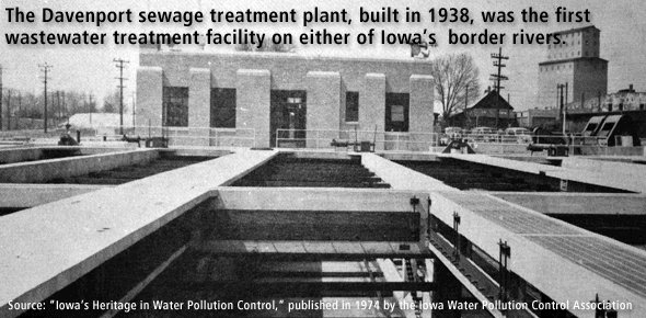 The city of Davenport did build a primary sewage treatment plant before World War II in 1938 in conjunction with construction of an interceptor sewer line along the Davenport riverfront by the U.S. Army Corps of Engineers. It was the first treatment plant built on either of Iowa's border rivers.