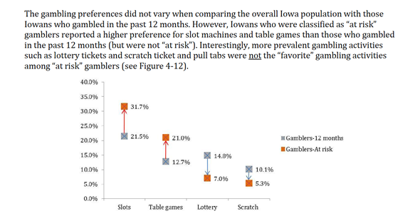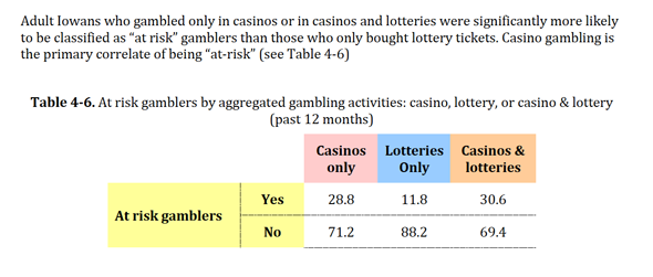 Not surprisingly, Iowans gambling only in casinos or in casinos and lotteries were much more likely to be classified as "at risk" gamblers than those only playing the lottery. "Casino gambling is the primary correlate of being 'at risk,'" according to the health department study.