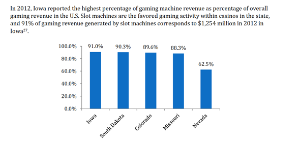 And, slot machines are the cash cow for casinos and the state, according to the report. "In 2012, Iowa reported the highest percentage of gaming machine revenue as percentage of overall gaming revenue in the United States," the report says. "Slot machines are the favored gaming activity within casinos in the state, and 91 percent of gaming revenue generated by slot machines corresponds to $1.25 billion in 2012 in Iowa."