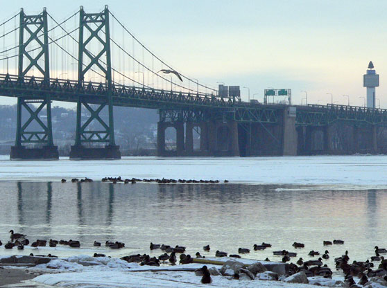 A light snow and much colder temperatures arrived with the first day of winter, turning the Mississippi River at Leach Park into a frosty scene. Warmer temperatures, expected to reach near 50 degrees later this week, are expected to melt the light snow which arrived Christmas Eve and Christmas Day.