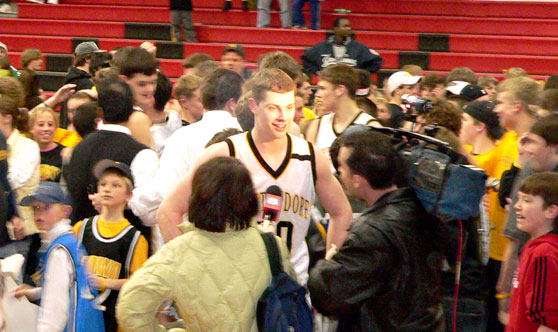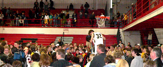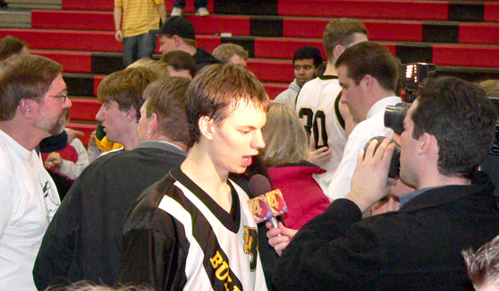 Andy Brooks helps cut down the nets after the Bulldog win while Pat Conrad gives a television interview.