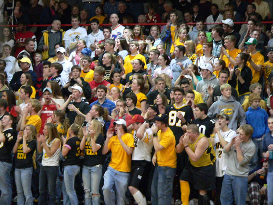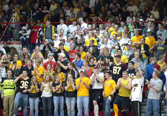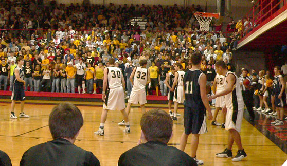 The Bettendorf Bulldogs played tenacious defense to defeat Pleasant Valley, 50-35, Tuesday night (3/8) and advance to the state 4A tournament next week in Des Moines. Below, the Spartans get to the foul line in the third period, but were unable to come back from a big halftime deficit. The Bulldogs built a commanding 29-12 lead at the half, and used key baskets by Brett Wessels and Pat Conrad to stifle a Pleasant Valley rally in the third period. Bettendorf, 21-1 on the season and ranked second in the state poll, will play Cedar Falls in the first round of the state tournament Wednesday (3/16). For additional photos of the game, click on "Read more" link below.