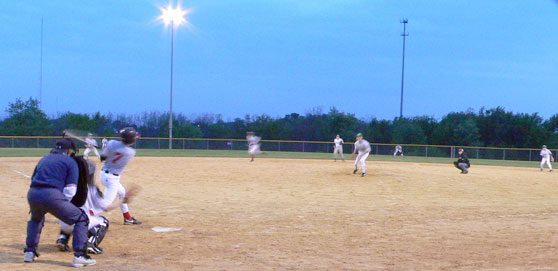 Despite unseasonably cool weather, Bettendorf-Pleasant Valley youth baseball is in full swing. Below, Pony League teams square off at one of the Crow Creek Park diamonds.