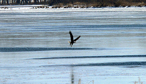 An American Bald Eagle takes flight along the Mississippi River shoreline in Bettendorf. With colder weather freezing up parts of the river, eagles have become a common sight even near the city's downtown riverfront.