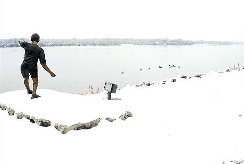 Icicles form on the face and arms of the "Skipper" bronze sculpture along the Leach Park riverfront. The ice coating on city streets and highways canceled most activities and area school students were given a one-day vacation.