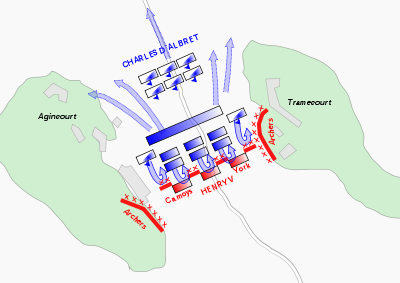 Over 80 percent of Henry’s men were archers/longbowsmen. Half of the French were dismounted knights and men-at-arms, a thousand or so mounted knights, and the balance archers. These counter-posed armies came to face each other in a very narrow strip of recently plowed open muddy land surrounded by dense forest.